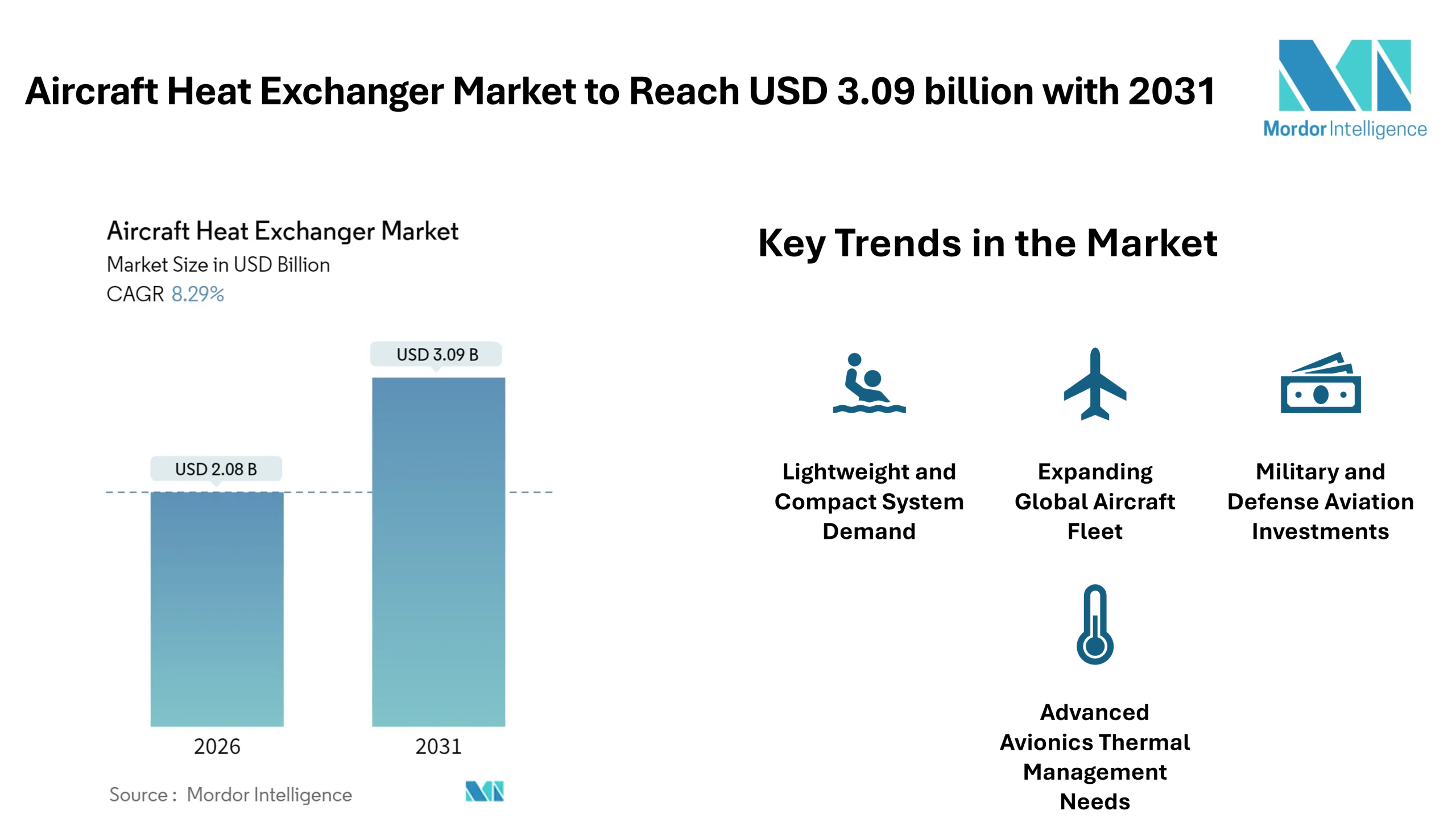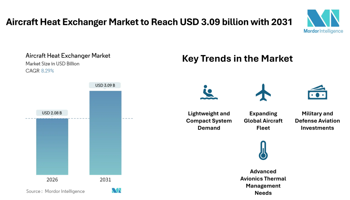 According to Mordor Intelligence, the aircraft heat exchanger market size in 2026 is estimated at USD 2.08 billion, growing from a 2025 value of USD 1.92 billion, with 2031 projections showing USD 3.09 billion at a CAGR of 8.29% over the 2026–2031 period.