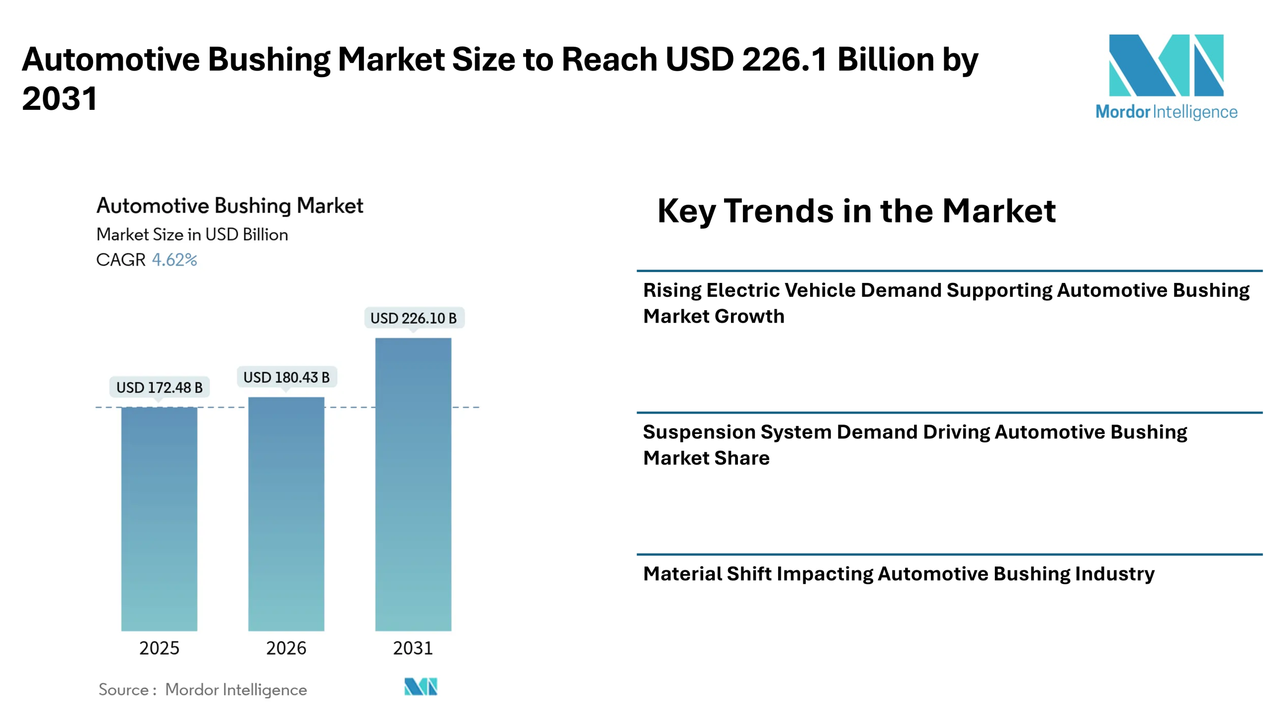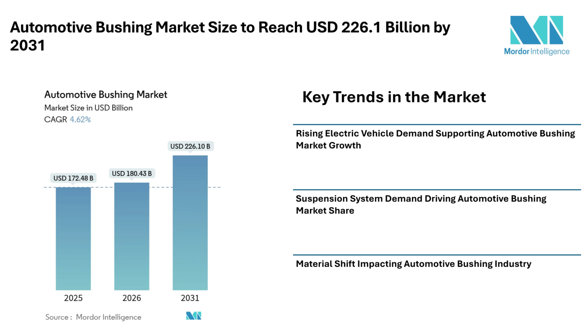 According to Mordor Intelligence, the automotive bushing market size is projected to grow from USD 172.48 billion in 2025 to USD 180.43 billion in 2026 and is expected to reach USD 226.1 billion by 2031, registering a CAGR of 4.62% during the forecast period. The study on automotive bushing market size indicates steady expansion as vehicle production stabilizes and electrification gains pace across major regions.