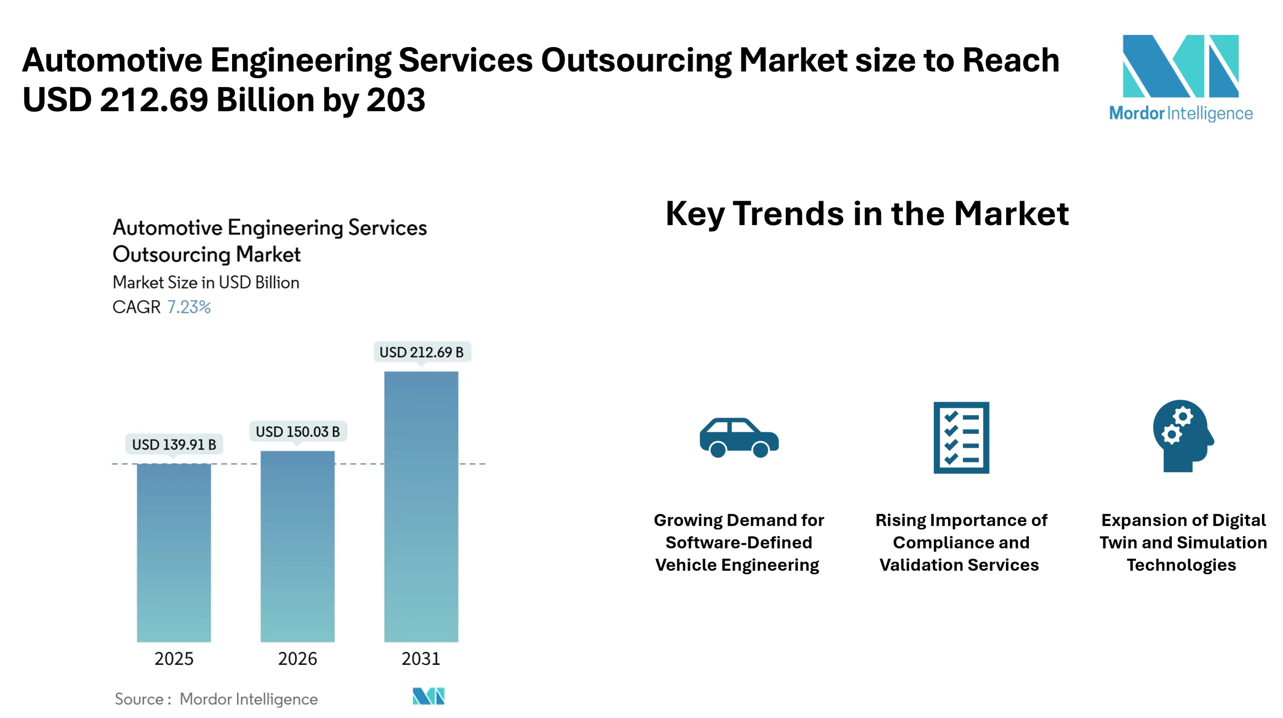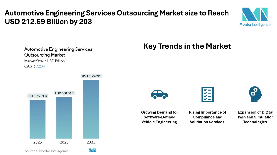 According to Mordor Intelligence, the automotive engineering services outsourcing market size is projected to grow from USD 139.91 billion in 2025 to USD 150.03 billion in 2026, and further reach USD 212.69 billion by 2031, registering a CAGR of 7.23% during the forecast period. This market forecast reflects the growing dependence of OEMs on specialized engineering providers to manage complex product development cycles.