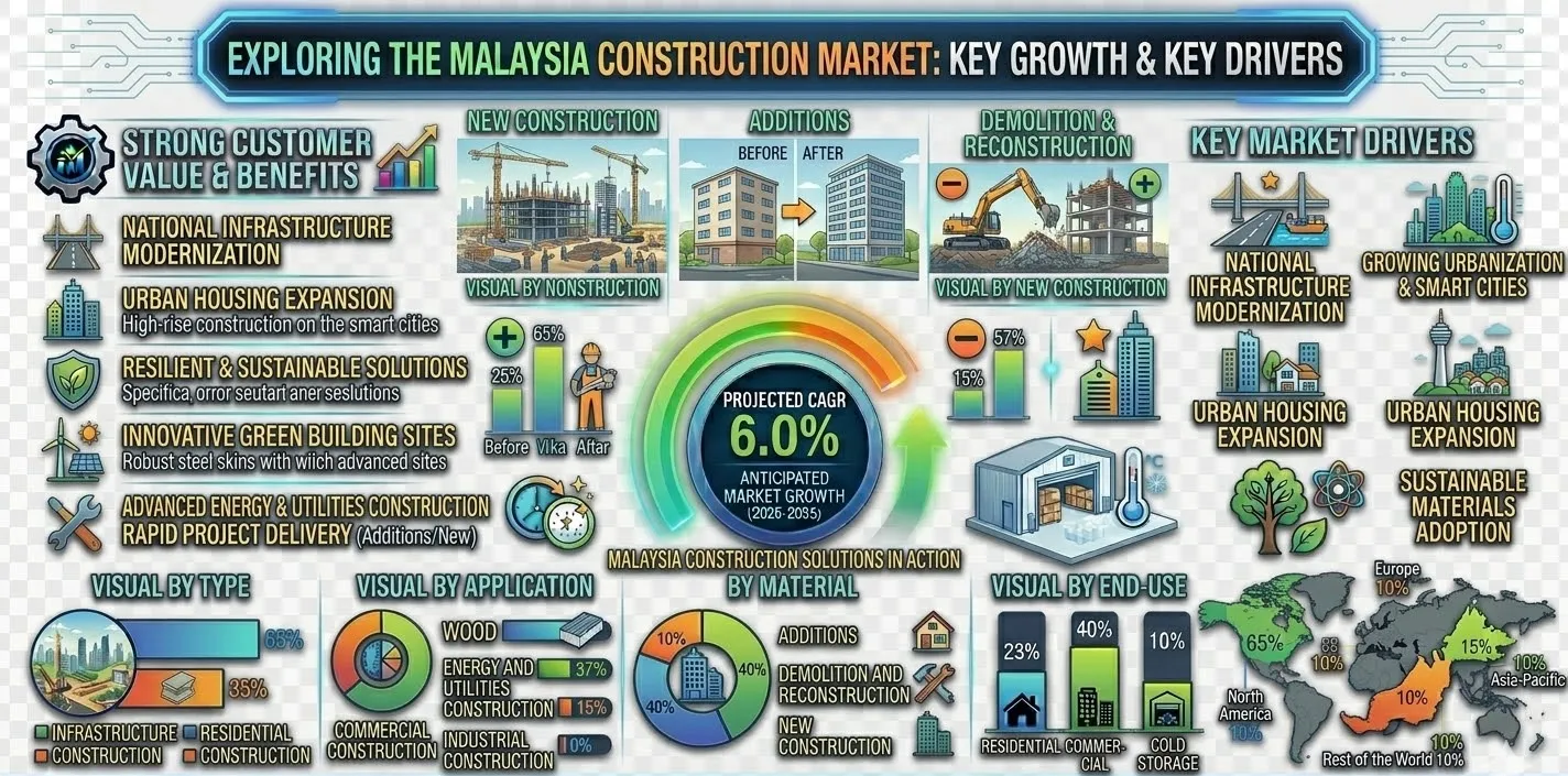 According to a detailed analysis by Market Research Future, the Malaysia construction market was valued at USD 35.4 billion in 2024 and is forecast to reach USD 67.2 billion by 2035, growing at a compound annual growth rate (CAGR) of 6.0% during the forecast period 2025–2035. This near-doubling of market size over a decade reflects the convergence of multiple growth catalysts — from state-led megaprojects to private sector residential booms and an accelerating embrace of construction technology.