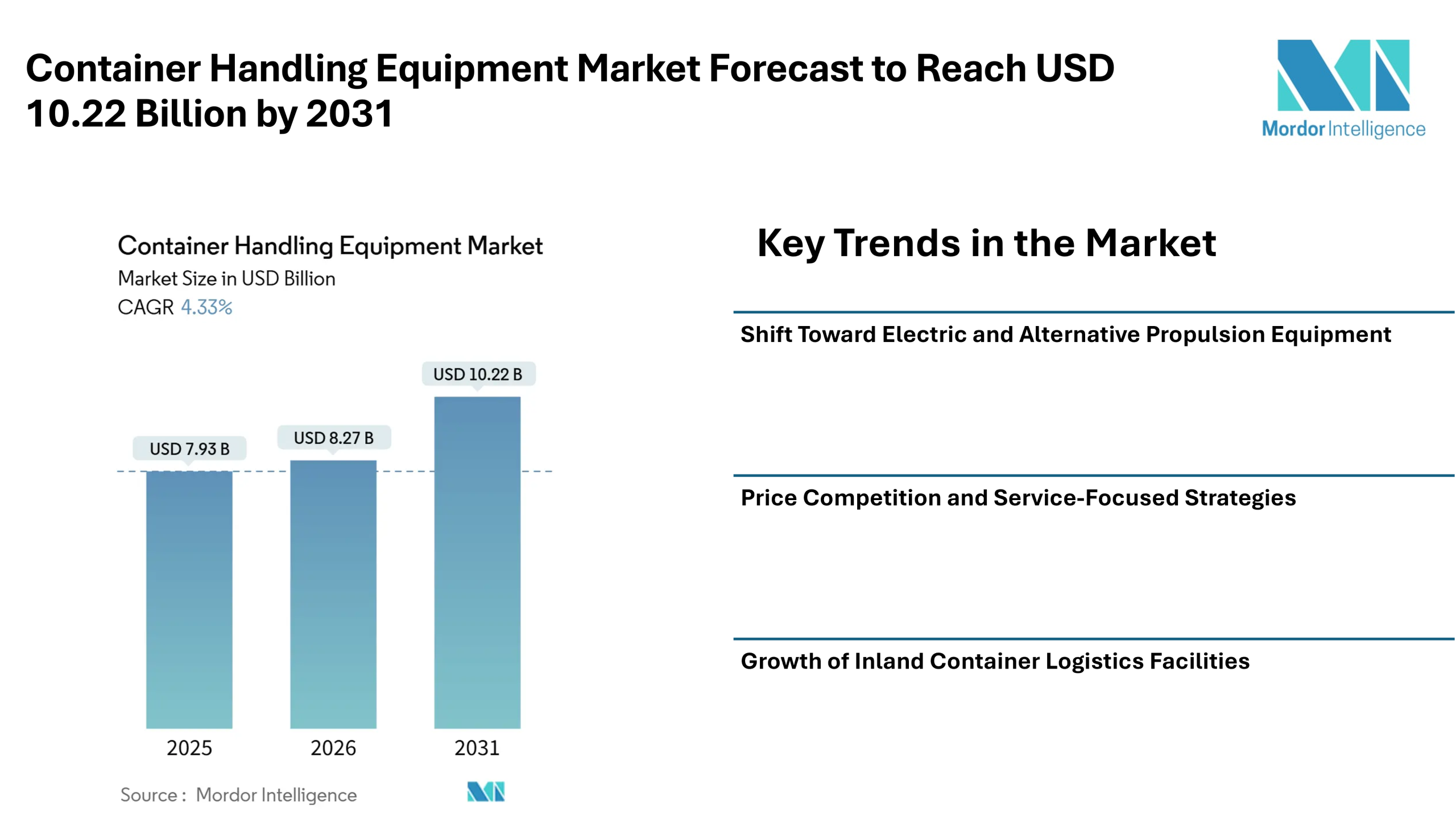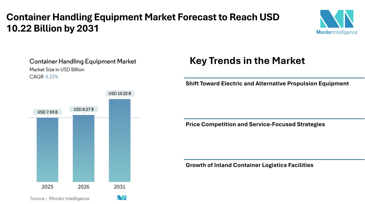 According to Mordor Intelligence, the container handling equipment market size is expected to grow from USD 7.93 billion in 2025 to USD 8.27 billion in 2026, with the container handling equipment market forecast indicating it may reach USD 10.22 billion by 2031. This progress reflects consistent investments in cargo handling infrastructure and modern equipment used in terminals, depots, and freight facilities worldwide.