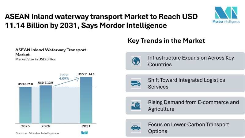 According to Mordor Intelligence, the ASEAN Inland waterway transport market size in 2026 is estimated at USD 9.12 billion, growing from USD 8.76 billion in 2025 and projected to reach USD 11.14 billion by 2031, at a CAGR of 4.09%. This ASEAN Inland waterway transport market growth reflects increasing reliance on cost-efficient cargo movement and the region’s extensive river networks. The market continues to expand steadily, supported by infrastructure investments, trade activity, and changing logistics needs across Southeast Asia.
