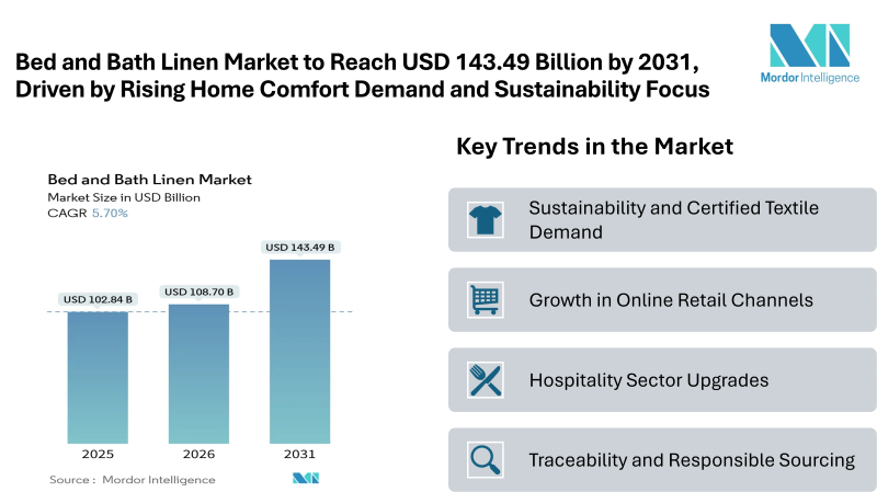According to Mordor Intelligence, the bed and bath linen market size is projected to grow from USD 102.84 billion in 2025 to USD 108.70 billion in 2026, reaching USD 143.49 billion by 2031, at a CAGR of 5.70% during the forecast period. The market growth is supported by steady demand from households, hospitality upgrades, and increasing consumer attention toward comfort and quality in home textiles.