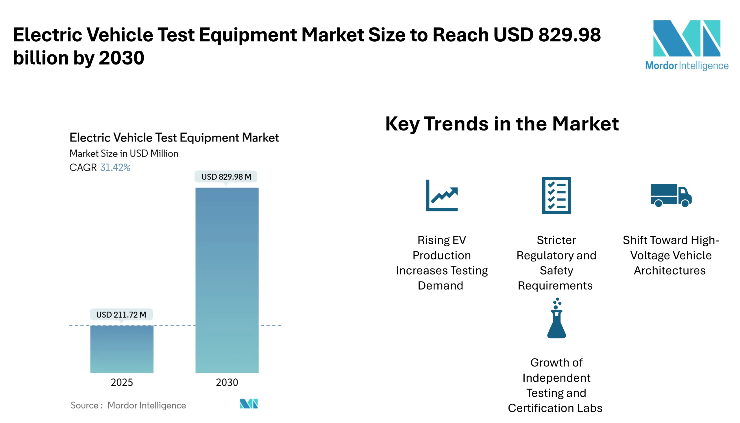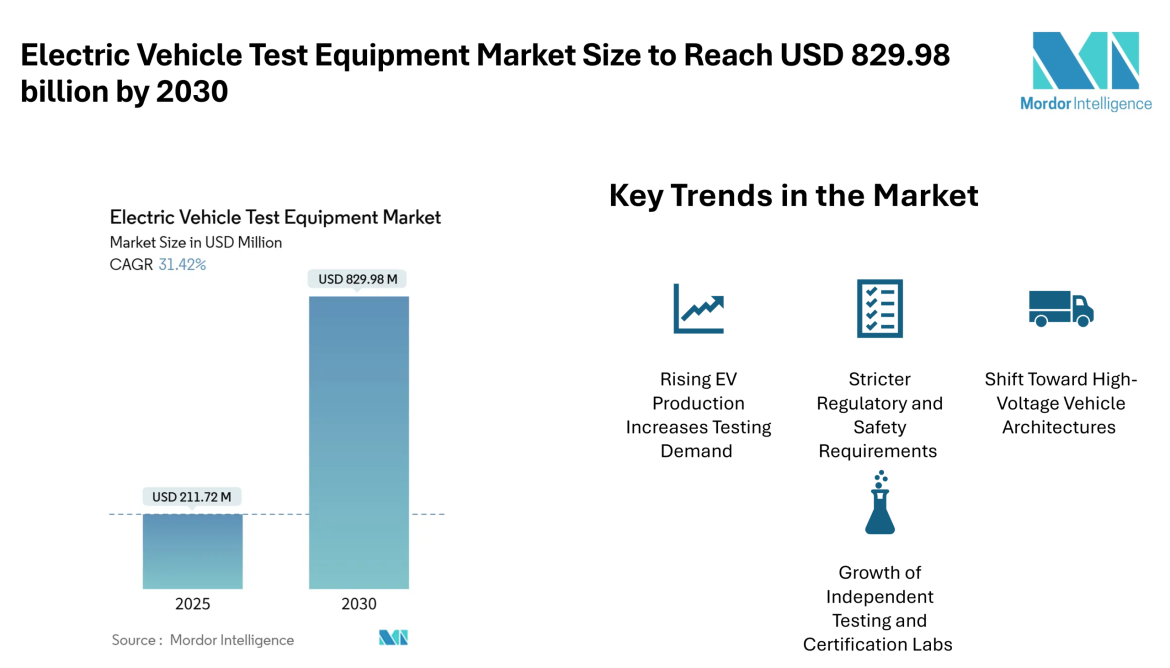 The global Electric Vehicle Test Equipment market size is witnessing rapid growth as electric vehicle production continues to scale worldwide. According to Mordor Intelligence, the market was valued at approximately USD 211.72 million in 2025 and is projected to reach around USD 829.98 million by 2030, registering strong growth over the forecast period. This expansion is driven by increasing EV model launches, rising adoption of high-voltage vehicle architectures, and the need for advanced validation of batteries, power electronics, and charging systems.