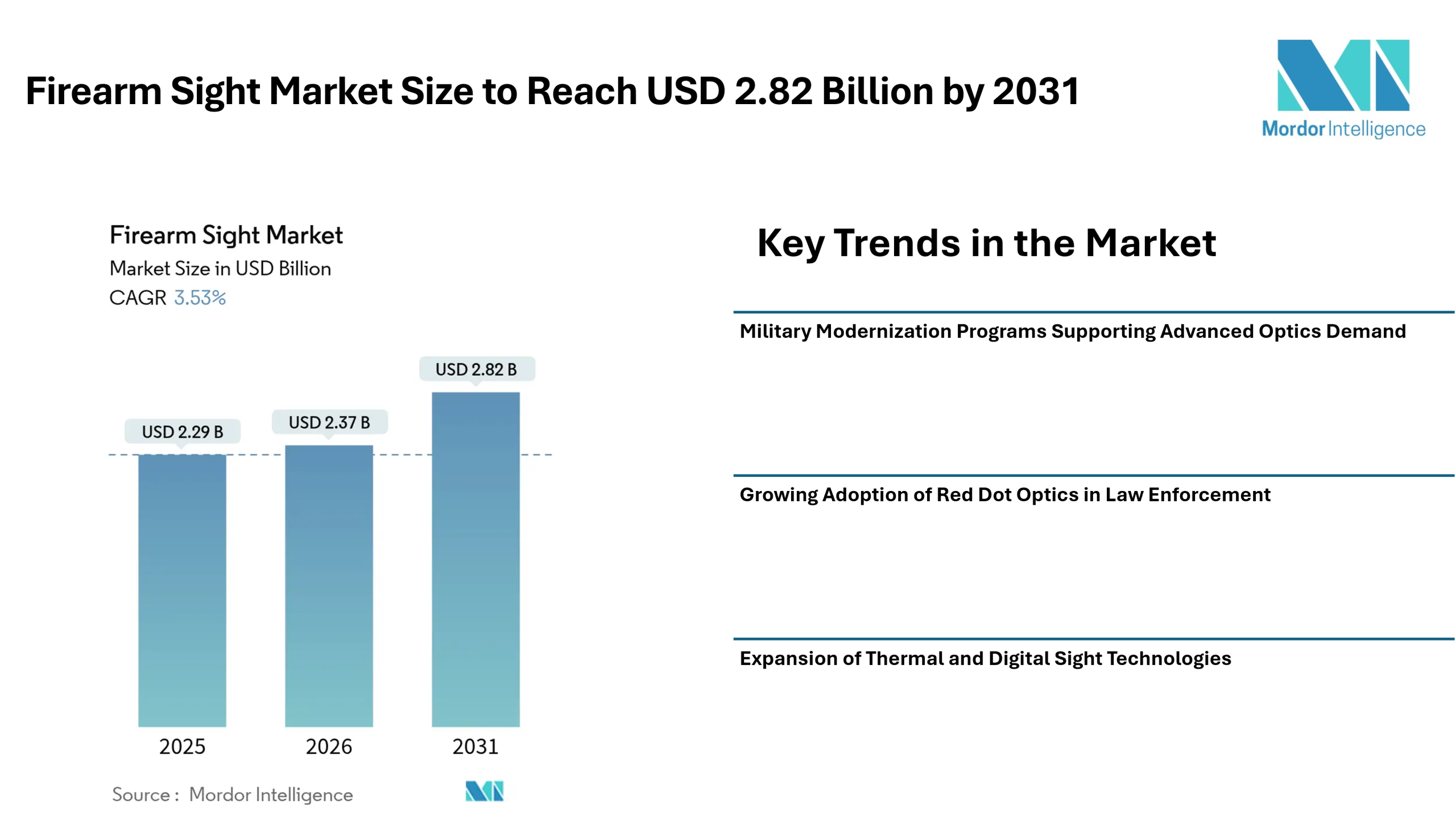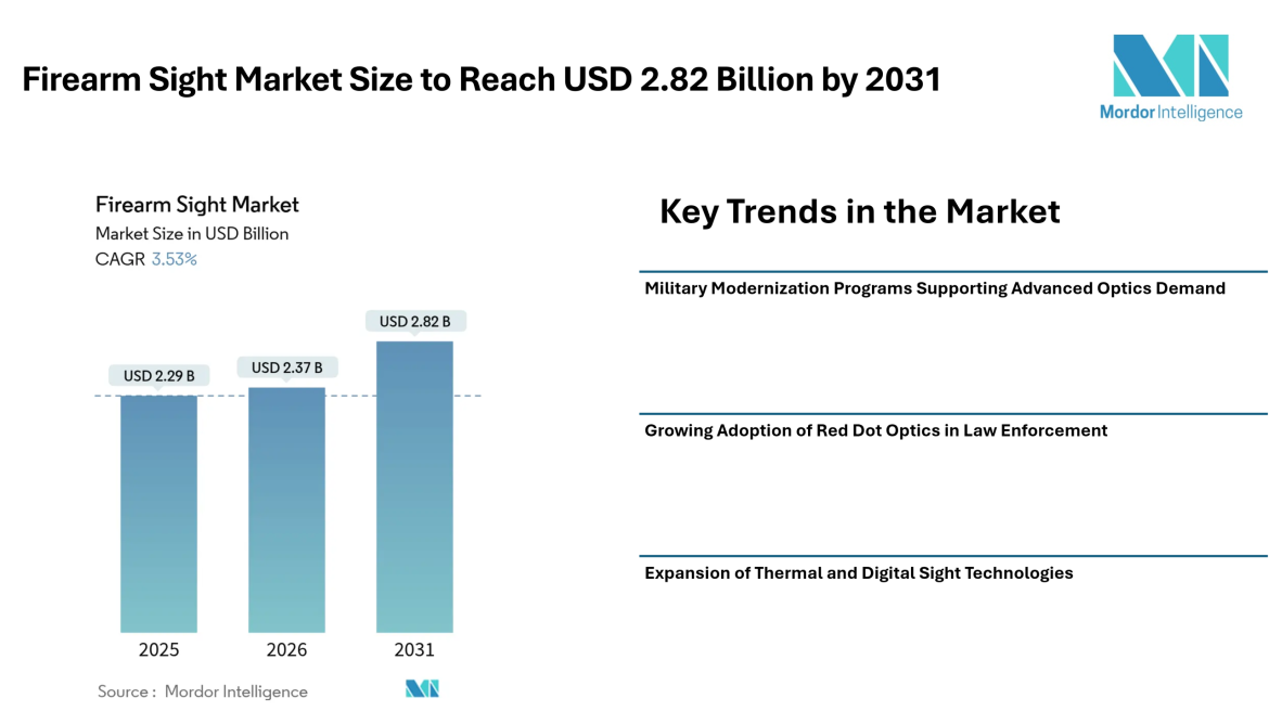 According to Mordor Intelligence, the global firearm sight market size is projected to reach USD 2.82 billion by 2031, growing from USD 2.37 billion in 2026 at a CAGR of 3.53% during the forecast period. The steady expansion of the firearm sight industry is linked to ongoing military modernization programs, increased adoption of optic-equipped service weapons, and the integration of digital and thermal technologies into conventional sighting systems.