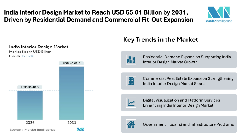 According to Mordor Intelligence, the India interior design market size is valued at USD 35.48 billion in 2026 and is projected to reach USD 65.01 billion by 2031, registering a CAGR of 12.87%. This steady India interior design market growth reflects increasing demand from residential housing, commercial spaces, and organized design platforms offering integrated solutions. The India interior design industry is witnessing rising adoption of modular layouts, turnkey packages, and branded interior systems across metro and non-metro cities.