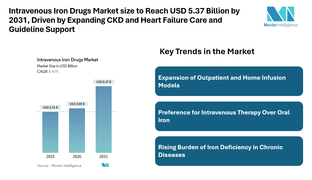 According to Mordor Intelligence, the intravenous iron drugs market size is witnessing steady expansion, with the intravenous iron drugs market size projected to increase from USD 3.31 billion in 2025 to USD 3.59 billion in 2026, and further reach USD 5.37 billion by 2031, registering a CAGR of 8.40% during the forecast period. This intravenous iron drugs market forecast reflects the growing need for rapid and effective correction of iron deficiency anemia across chronic kidney disease, heart failure, inflammatory bowel disease, and oncology care.