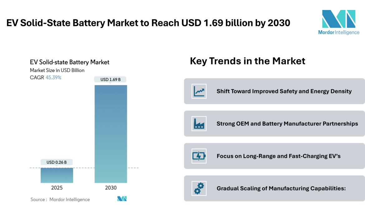 EV Solid-State Battery Market to Reach USD 1.69 billion by 2030, Driven by Safety-Focused Designs and OEM Integration – Mordor Intelligence