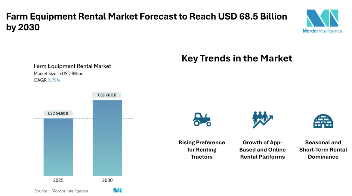 The Farm Equipment Rental market size projected to grow from an estimated USD 54.8 billion in 2025 to approximately USD 68.5 billion by 2030 according to the latest market insights. This growth reflects increased demand for flexible access to tractors, harvesters, and related machinery, supported by digital rental solutions and supportive mechanization programs in key agriculture regions. The forecast period, extending through 2030, highlights sustained demand patterns shaped by evolving farming needs, expanding digital platforms, and diverse regional forces influencing rental adoption