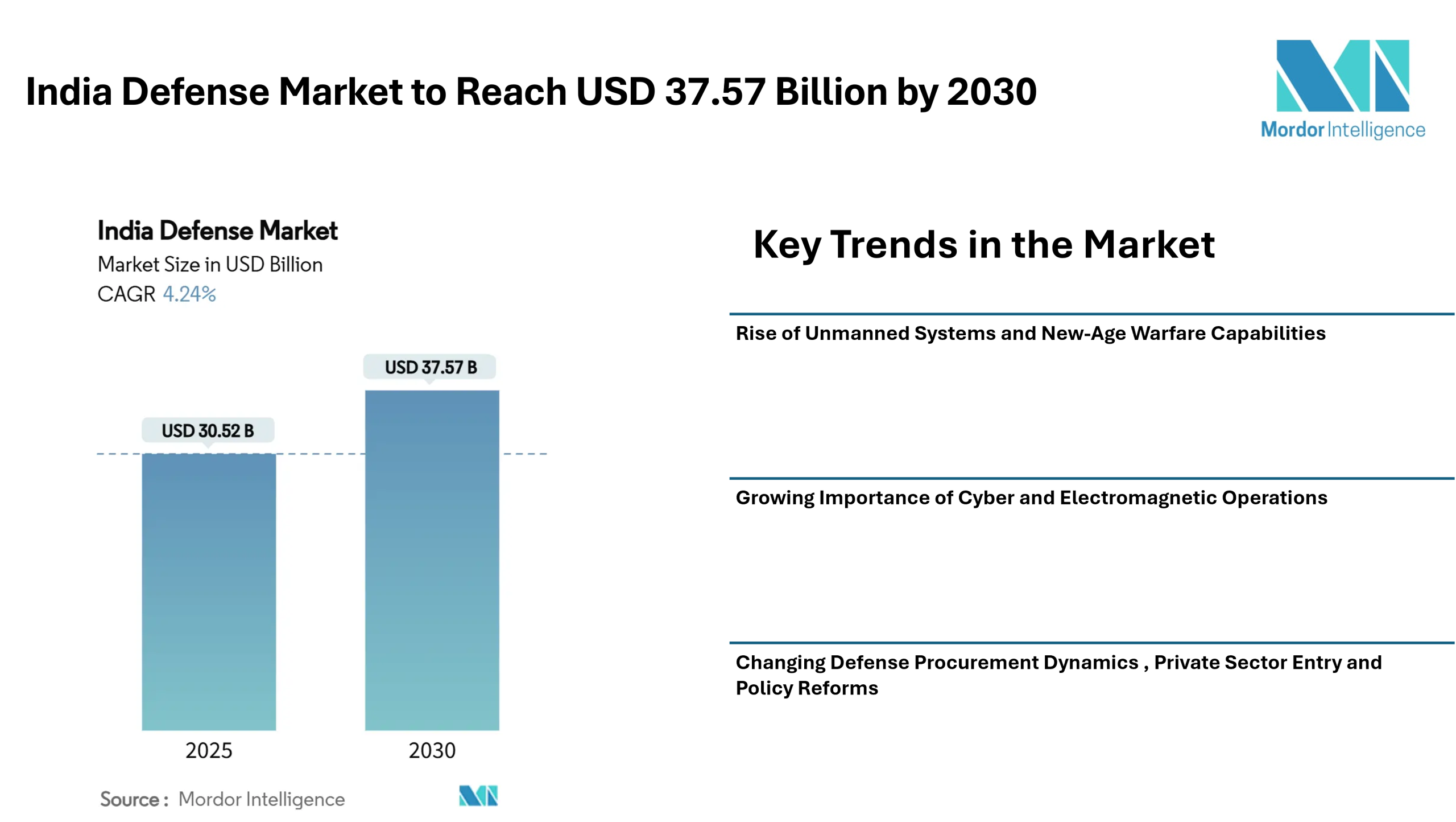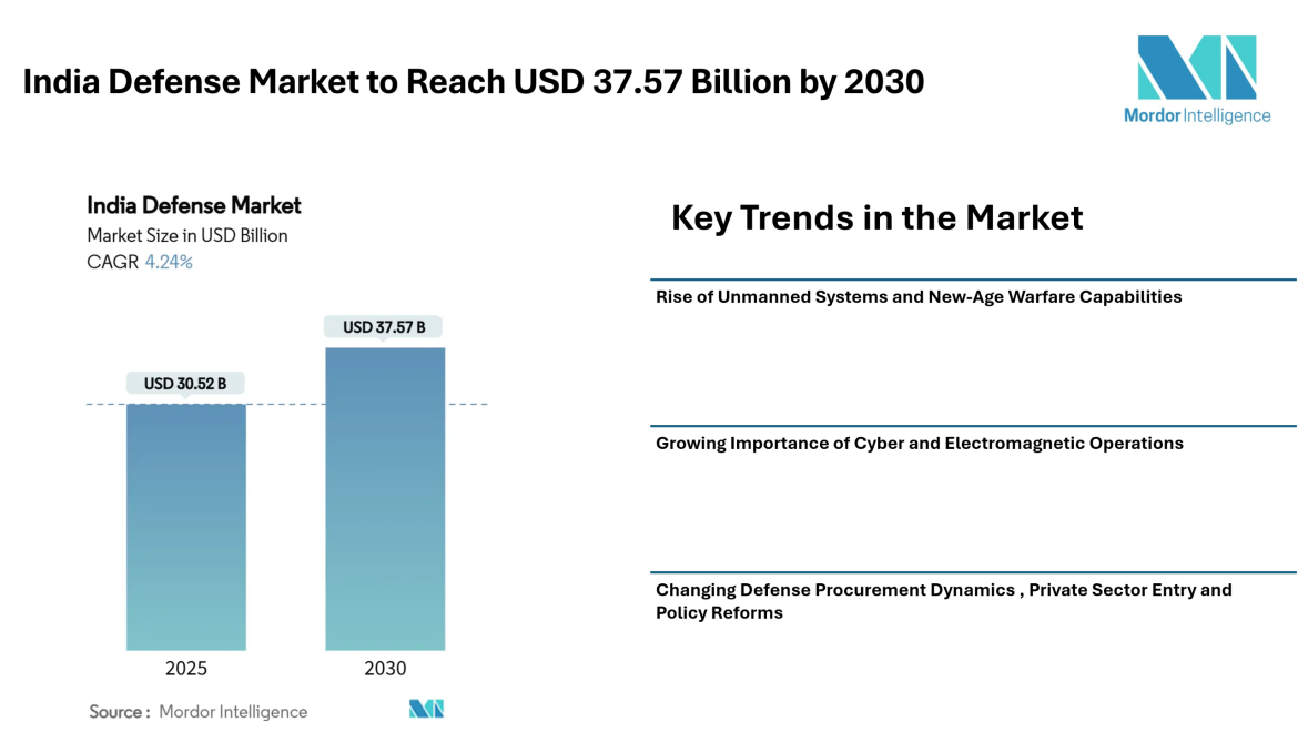 The india defense market stands at a critical juncture. With a projected growth to around USD 37.6 billion by 2030, the market is entering a phase where modernization, diversification, and self-reliance are becoming the defining themes. The combination of increased defense budgets, domestic sourcing mandates, and greater private-sector participation is transforming the supply landscape.