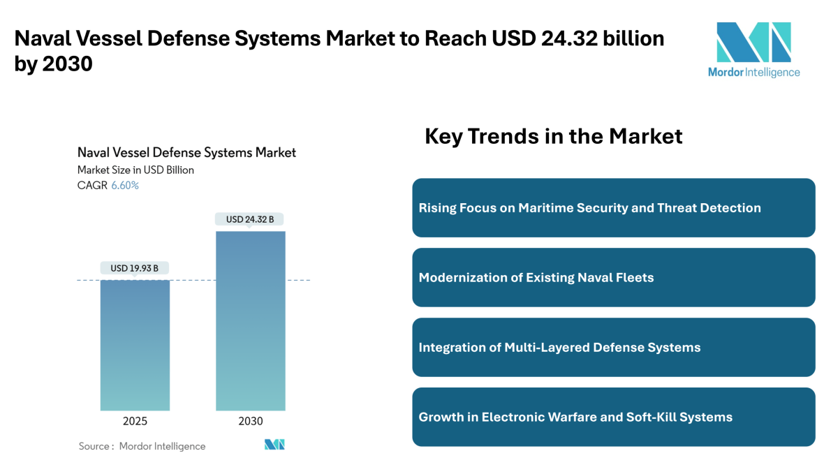 Growing geopolitical tensions, territorial disputes, and increased naval patrol activities are driving demand for advanced vessel defense systems capable of detecting, tracking, and neutralizing multiple threat types.
