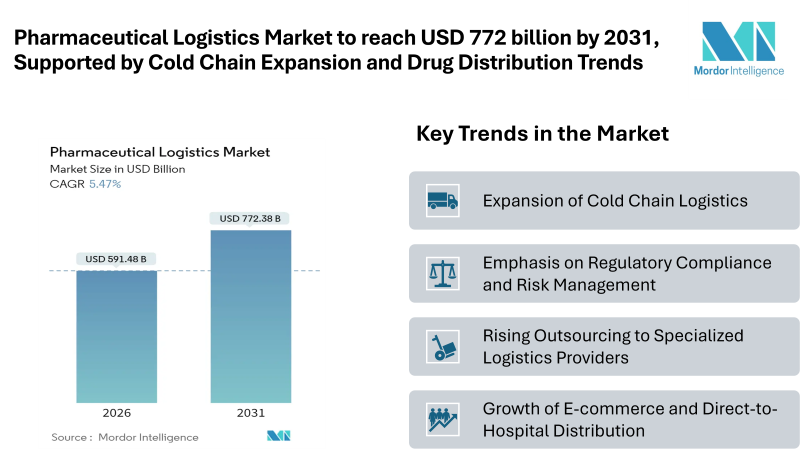 According to Mordor Intelligence, the pharmaceutical logistics market size was valued at USD 560.81 billion in 2025 and estimated to grow from USD 591.48 billion in 2026 to reach USD 772.38 billion by 2031, at a CAGR of 5.47%. The pharmaceutical logistics market plays a critical role in ensuring the safe, timely, and compliant movement of medicines, vaccines, biologics, and medical products across domestic and international supply chains.