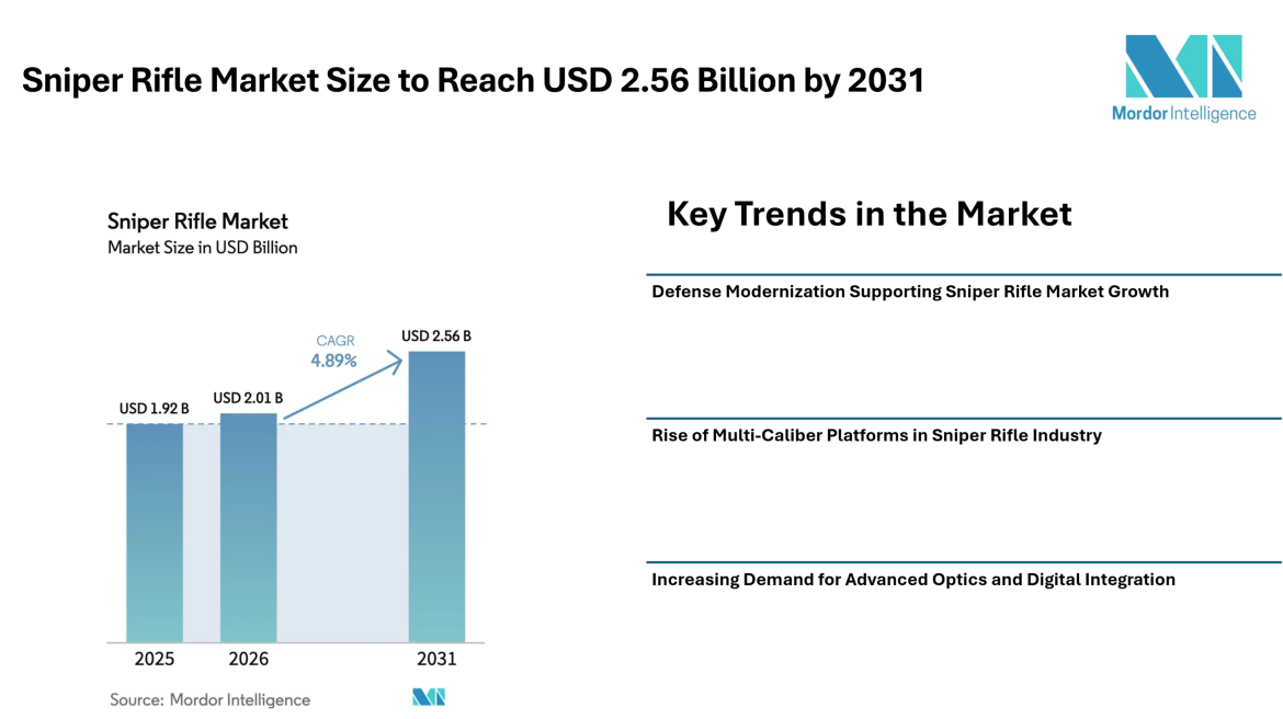 According to Mordor Intelligence, the sniper rifle market size is estimated at USD 2.01 billion in 2026, increasing from USD 1.92 billion in 2025, and is projected to reach USD 2.56 billion by 2031, reflecting a CAGR of 4.89% during the forecast period.