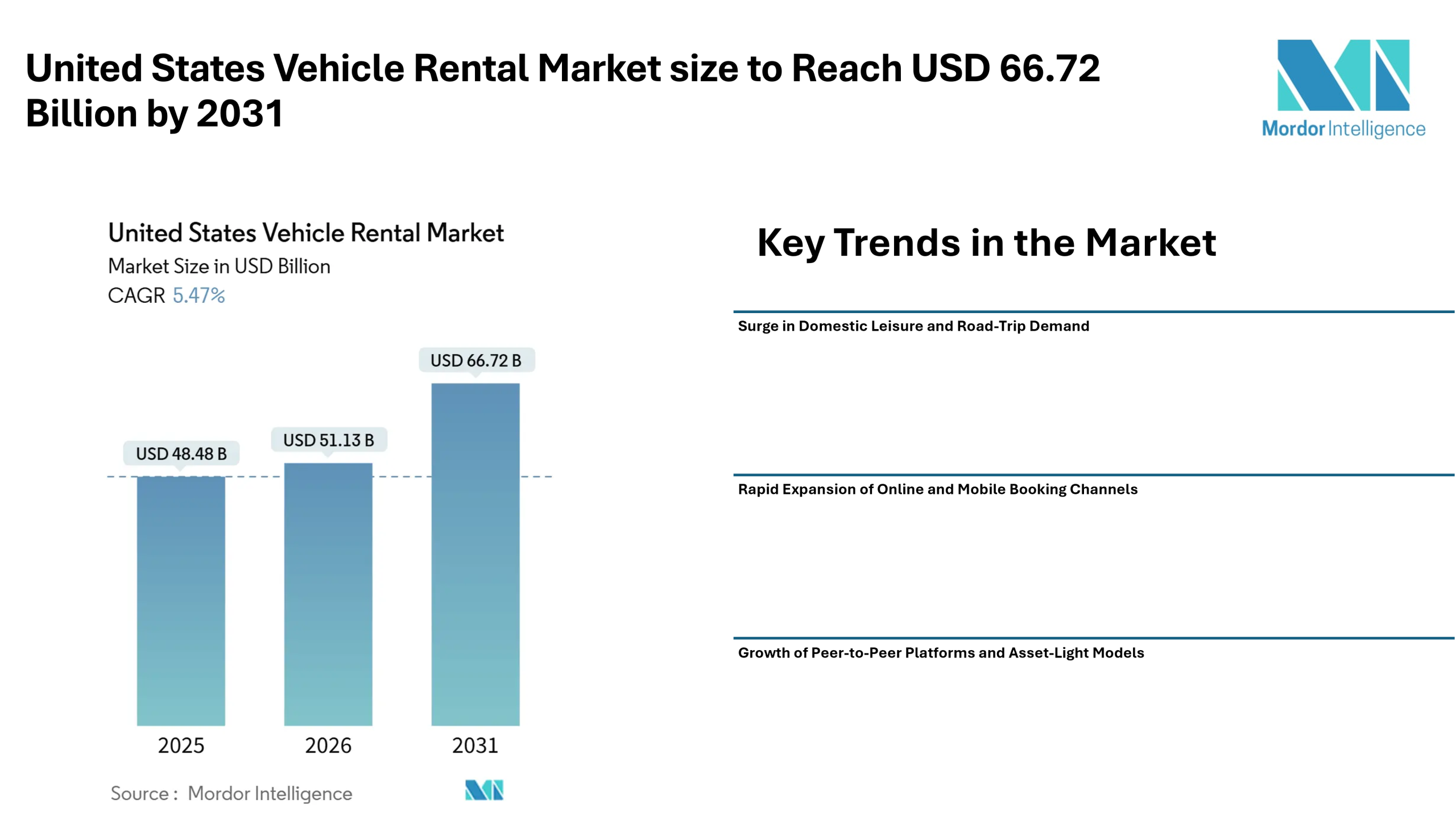 According to Mordor Intelligence, the United States vehicle rental market size is projected to grow from USD 48.48 billion in 2025 to USD 51.13 billion in 2026 and is expected to reach USD 66.72 billion by 2031, registering a CAGR of 5.47% during the forecast period. The United States vehicle rental market forecast reflects steady expansion supported by leisure travel recovery, hybrid work patterns, and a rising shift toward digital platforms.